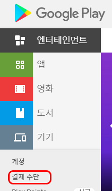 2.플레이스토어 메인페이지로 이동되었습니다. 여기에서는 왼쪽 메뉴중 계정 밑 '결제 수단'이라는 메뉴를 클릭하여 이동합니다.