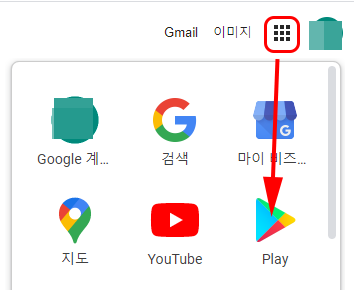 1.구글 홈페이지에 접속해줍니다. 그리고 오른쪽 상단의 이미지와 내 아이콘사이의 네모박스9개가 있는 버튼을 클릭 후