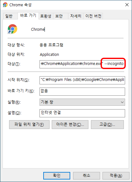 2. 대상 부분에서 ~~~chrome.exe" 로 끝나는부분에서 한칸띄고 --incognito 를 입력을 합니다. 그리고 확인버튼을 눌러서 저장을 합니다. 저장 후 해당 바로가기를 실행하면 바로 시크릿모드로 실행되는 것을 볼 수 있습니다.