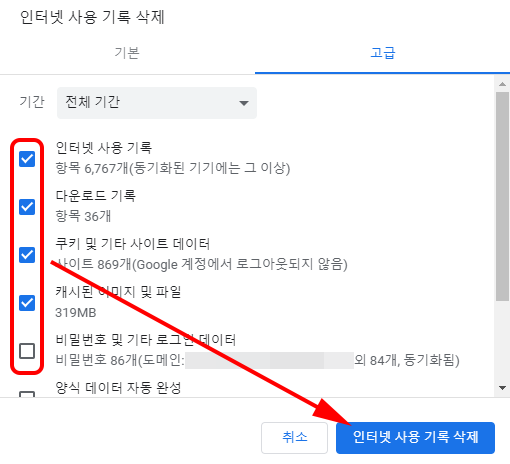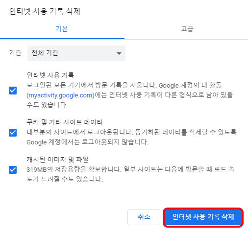 오른쪽 사진은 상단 메뉴 기본 옆에 있는 고급 메뉴 입니다. 인터넷 사용 기록뿐만 아니라, 다운로드기록,비밀번호 및 기타 로그인 데이터, 양식 데이터 자동 완성 등 더 많은 내용을 삭제 할 수 있습니다. 전체 모든 내용을 삭제하고 싶다면 고급에서 전체 체크 후 인터넷 사용 기록 삭제를 클릭해주세요.