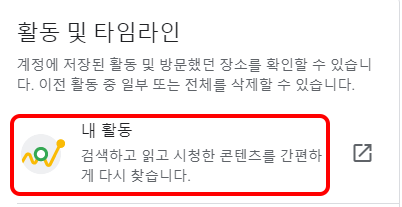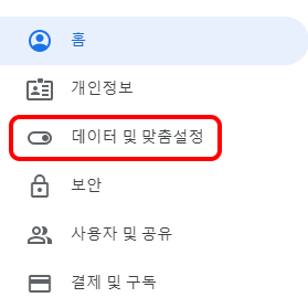 2.왼쪽 메뉴 '데이터 및 맞춤 설정'을 클릭합니다. 그리고 스크롤을 조금 내려서 활동 및 타임라인에서 '내 활동' 이라는게 보이면 클릭을 합니다.