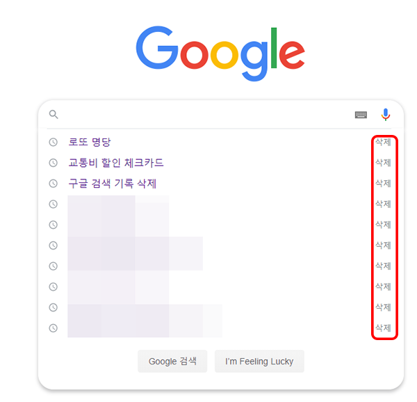 1. 아래 사진과 같이 구글에서 검색했을시 기록이 다 남습니다. 오른쪽 삭제를 개별로 눌러서 삭제 할 수 있지만 검색량이 많으면 일일이 클릭해서 지우는 것도 일이 됩니다.