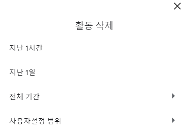 지난1시간,지난1일,전체기간,사용자 설정 범위 4개중 내가 원하는 것으로 삭제를 진행 하면 됩니다. 전체 다 지우고 싶다면 전체기간을 선택 하시면 됩니다. 전 전체 기간을 선택해 보겠습니다.