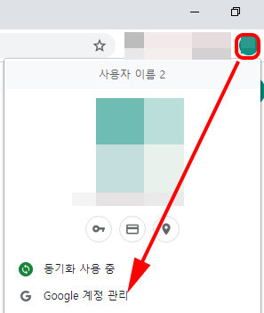 한번에 삭제하고 구글 웹사이트에 남아 있는 기록도 삭제해보도록 하겠습니다. 오른쪽 사진과 같이 크롬에서 점3개 옆 내 아이콘을 클릭하고 구글 계정관리를 클릭합니다.