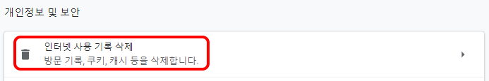 3.설정 메뉴 메인 화면에서 중간쯤 '개인정보 및 보안' 이라는 메뉴가 있는데 그 중 첫번째 서브 메뉴 '인터넷 사용 기록 삭제' 를 찾아서 클릭합니다.
