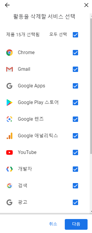 4. 전체 기간을 선택하면 내가 삭제할 서비스를 선택해야 합니다. 다 지우고 싶다면 전체 선택 후 다음을 클릭하면 오른쪽과 같이 삭제 할 데이터를 보여줍니다. 삭제 버튼을 클릭하면 삭제가 진행됩니다.