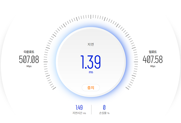 다운로드,업로드,지연시간 테스트까지 진행이 됩니다. 다행히 손실율은 없습니다.