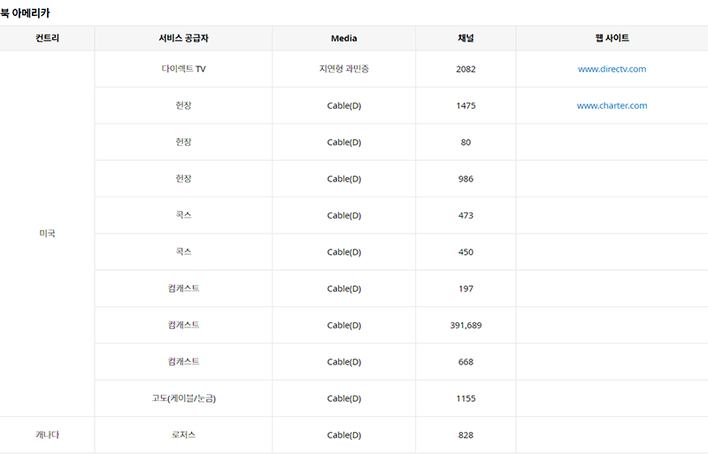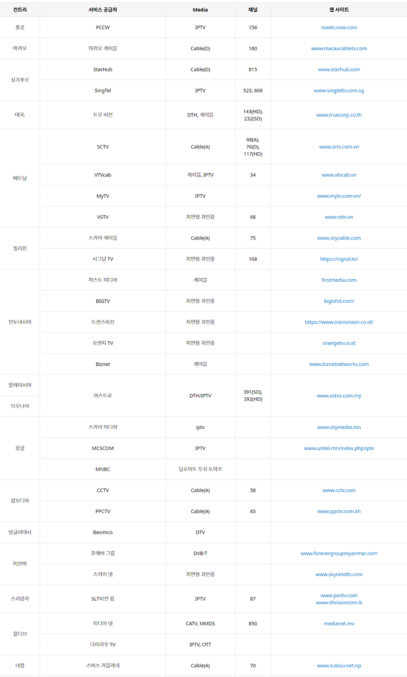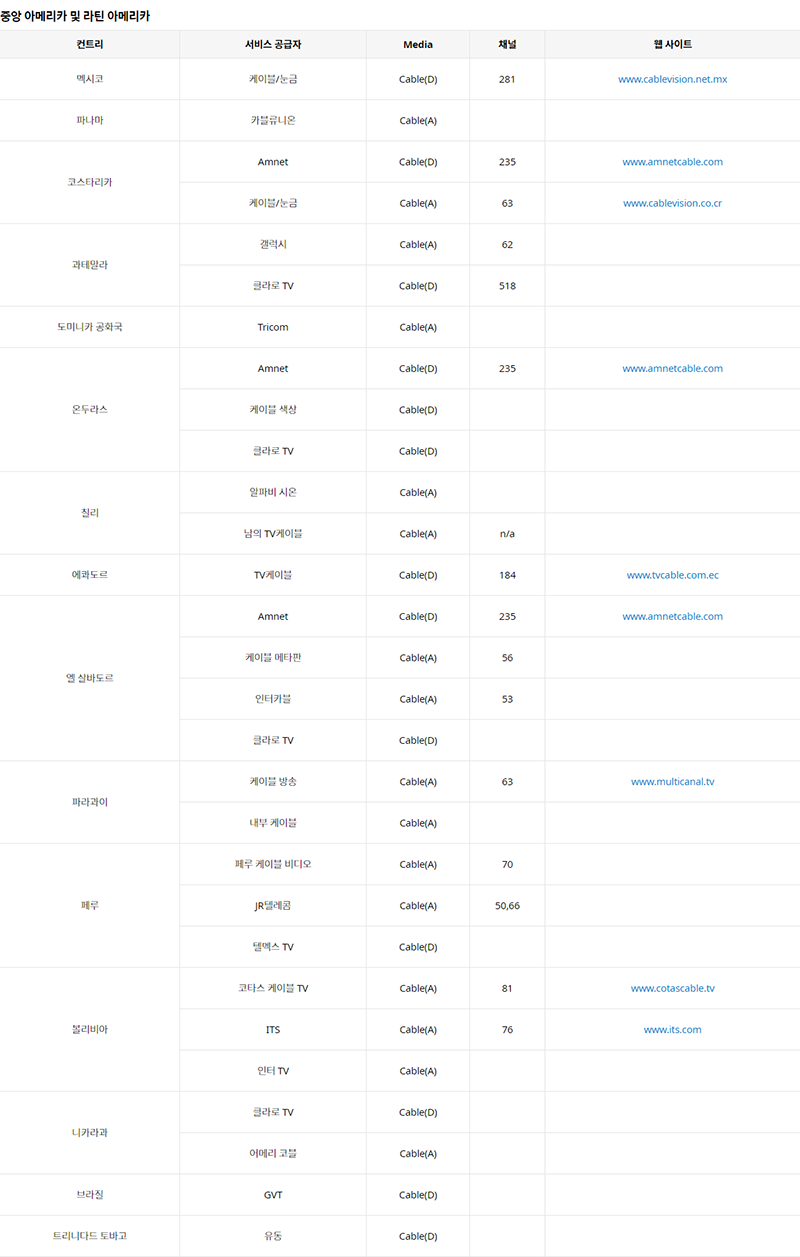 일부 국가의 채널번호가 없어서 위 사진에 넣지 않았습니다. 아프리카,중동,러시아 지역의 채널번호는 나와 있지 않습니다.