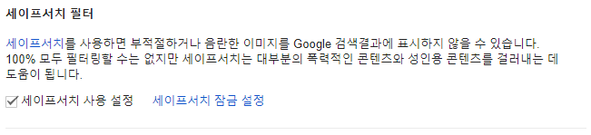 '부적절하거나 음란한 이미지를 Google 검색결과에 표시하지 않을 수 있습니다. 100% 모두 필터링 할 수는 없지만 세이프서치는 대부분의 폭력적인 콘텐츠와 성인용 콘텐츠를 걸러내는 데 도움이 됩니다.'