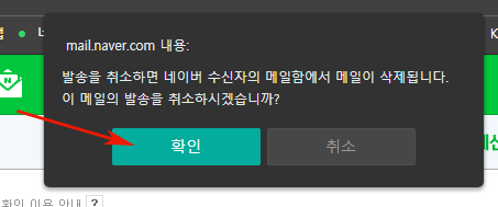5. 아래와 같은 팝업 메세지가 출력이 됩니다. '발송을 취소하면 네이버 수신자의 메일함에서 메일이 삭제됩니다. 이 메일의 발송을 취소하시겠습니까?' 확인을 눌러주시면 됩니다.