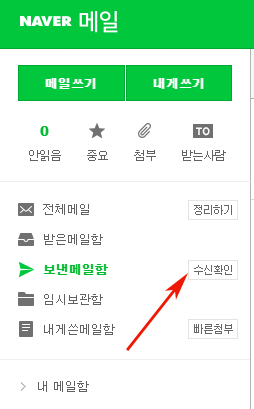 2. 일단 메일을 보낸 상태로 생각해보겠습니다. 일단 상대방이 읽었는지 수신확인을 해보겠습니다. 네이버 메일 오른쪽 메뉴에서 보낸메일함 옆의 네모박스 수신확인을 눌러주세요.