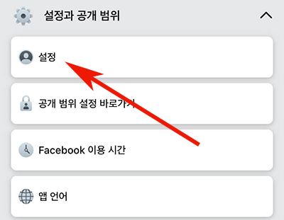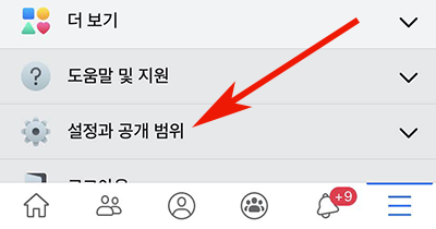 2. 그리고 하단부분을 보시면 메뉴 중 '설정과 공개 범위' 라는 항목이 있습니다. 터치해서 눌러주세요.