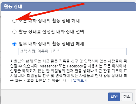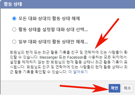 4. 그러면 아래의 설명이 바뀝니다. 내용을 읽어보시면 되고 더 알아보기를 누르면 자세한 내용을 알 수 있습니다. 궁금하시면 눌러 보시면 됩니다. 모든 대화 상대의 활동 상태 해제를 선택하고 확인을 눌러주세요.