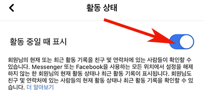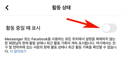 5. 그럼 '활동 중일 때 표시' 항목이 활성화 되어 있는 것이 보입니다. 가볍게 터치해주세요!