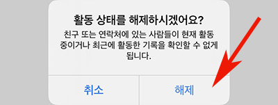 6. 그럼 아래와 같은 팝업 화면이 나옵니다. '활동 상태를 해제하시겠어요?' 해제를 눌러주세요.