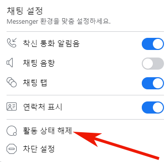 2. 그럼 채팅 설정 화면이 나옵니다. 여기에서 활동 상태 해제를 눌러주세요.
