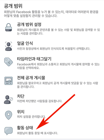 4. 그리고 스크롤을 조금 내려 주세요. 내리다 보면 공개범위 항목이 있습니다. 여기에서 가장 마지막 '활동 상태' 를 눌러주세요.
