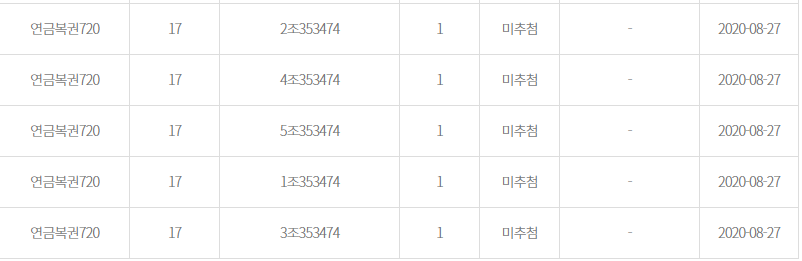 이번 17회에 제가 선택한 번호는 1~5조 353474번입니다. 사실 다른번호를 선택하였으나 이미 구매된 번호여서 다른 번호를 선택할 수 밖에 없었습니다.