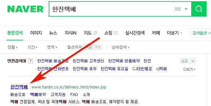 1. 한진택볘 반품 예약을 위해 검색 사이트에 한진택배로 검색을 해주세요. 보통 네이버,다음,구글등에 검색하면 상단에 한진택배 홈페이지가 조회됩니다.