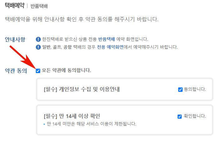 3. 그럼 이제 반품 택배 예약 화면으로 이동됩니다. 여기에서 상당 약관 동의에 모든 약관에 동의합니다를 체크해주세요.
