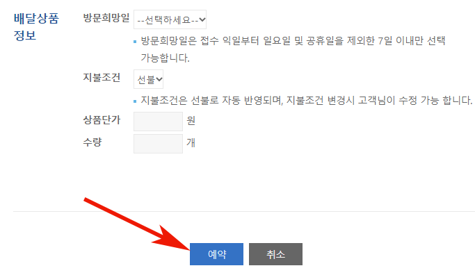 6. 자 마지막으로 방문 희망일을 선택해 주시면 되는데요. 작성일로부터 일주일 후까지만 선택이 가능합니다. 지불조건은 선불과 착불이 있습니다. 구매한 곳과 어떻게 이야기가 됐는지에 따라서 선불 착불 선택을 해주시면 됩니다.