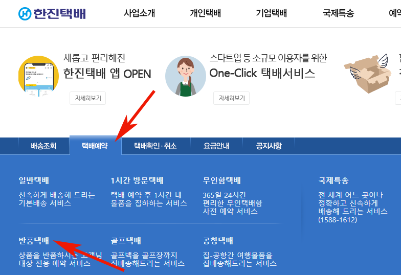 2. 한진택배 홈페이지 접속 후 메인 화면에서 중간쯤 보시면 택배예약이라는 메뉴가 보입니다. 클릭해보면 일반택배,1시간 방문택배,무인함택배,반품택배,골프택배,공항택배등을 선택할 수 있습니다. 그 중 4번째 반품택배를 선택해주세요.