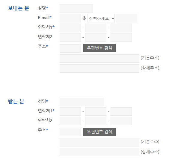 5. 그리고 보내는분은 내 정보를 입력을 해주시면 됩니다. 받는분은 기존에 보낸 곳의 성명,연락처등을 기입하면 되겠죠. 사전에 해당 쇼핑몰등에 어떤 이름과 주소로 보내야되는지 문의를 해보는 것도 방법입니다.