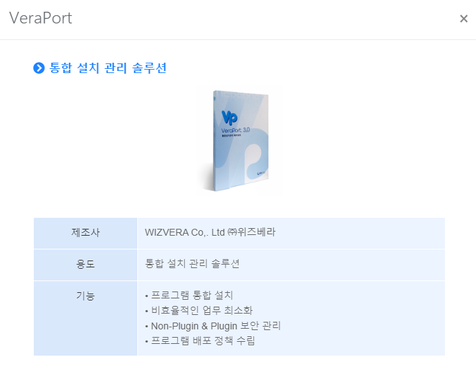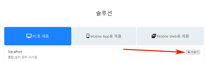 홈페이지 접속 후 스크롤을 이동하여 솔루션 부분을 보시면 PC용 제품 부문에 VeraPort라는 항목이 있습니다. 통합 설치 관리 시스템이라고 되어 있네요. 더보기를 눌러주시면 자세히 알수 있습니다.
