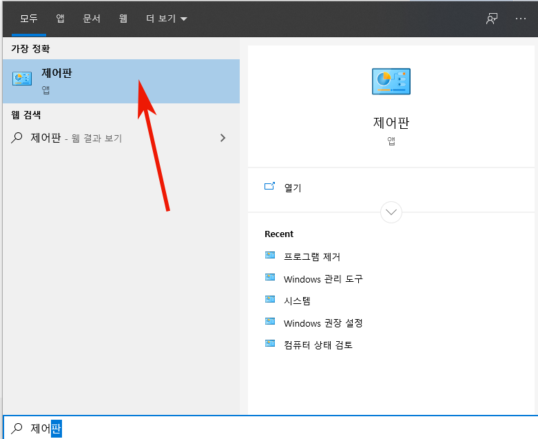 1. 왼쪽 하단 시작을 클릭 후 제어판을 검색해주세요. 그리고 클릭하여 실행해주시면 됩니다.