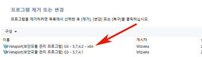 4. 아래와 같이 Veraport(보안모듈 관리 프로그램) G3 - 3,74,2 -x64와 3,7,4,1 두개가 검색이 되었습니다. 은행마다 버전을 다른것을 쓰는 것으로 추측이 됩니다.