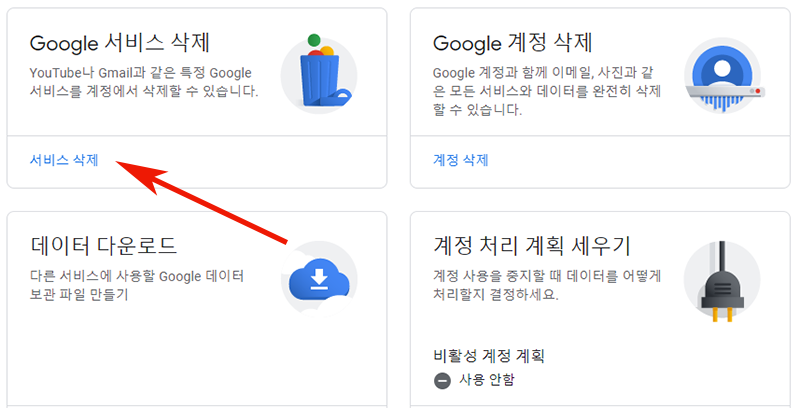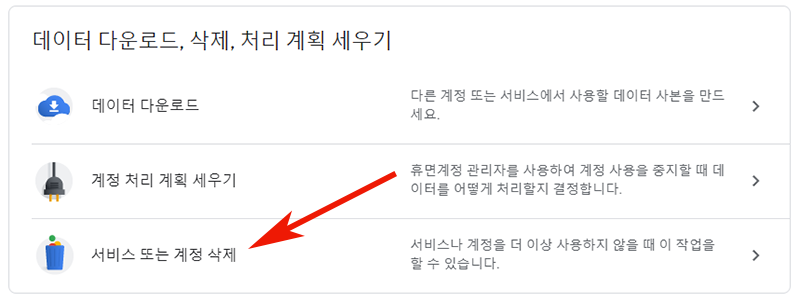 3. 그리고 스크롤을 조금 내려주시면 데이터 다운로드, 삭제, 처리 계획 세우기 메뉴에서 3번째 서비스 또는 계정 삭제를 클릭해주세요.