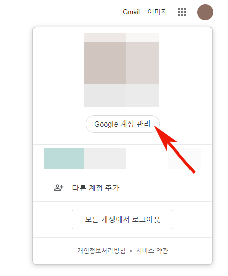 1. 삭제를 위해서 구글 홈페이지로 접속해주세요. 그리고 오른쪽 상단의 내 아이콘을 눌러주세요. 그리고 Google 계정 관리를 클릭해줍니다.