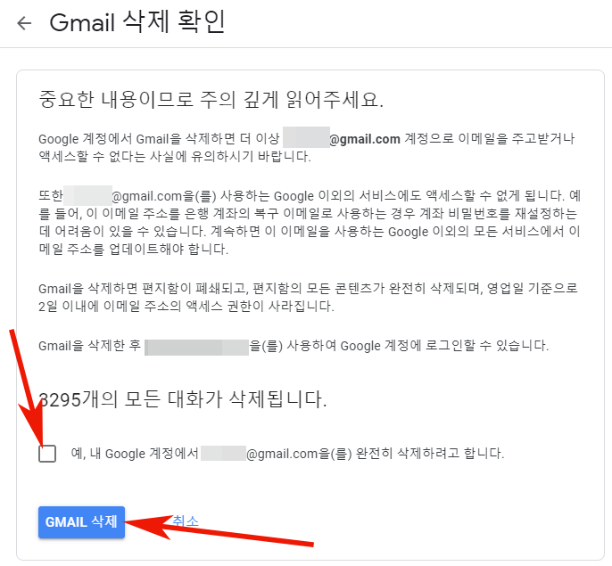 내용을 읽어보시고 하단에 체크를 하고 GMAIL 삭제를 눌러주시면 끝이납니다.