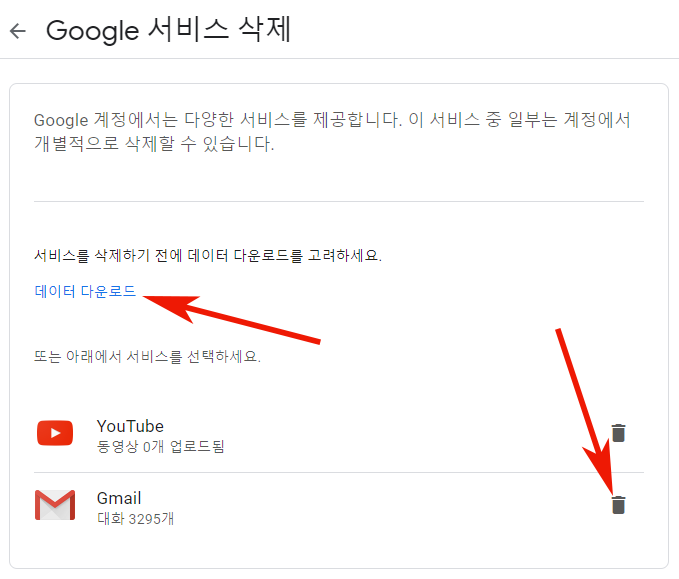 5. Google 서비스 삭제 전에 데이터 다운로드를 받아주시길 바랍니다. 백업으로 생각해주시면 됩니다. 그리고 하단의 Gmail에서 휴지통 버튼을 눌러주세요.