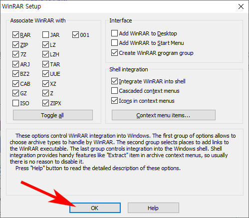 4. 설치과정에서 아래와 같은 화면이 나오는데요. 오른쪽 상단은 압축 해제가 가능한 확장자명을 고를수 있습니다. RAR말고도 ZIP,7z,등 선택이 가능합니다. 아래는 기본값이니 원치 않으시면 RAR을 제외한 확장차는 체크 해제를 해주시면 됩니다.