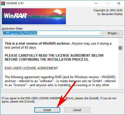 3. 다운로드 받은 파일을 실행시켜주세요. 그러면 설치 진행을 위한 창이 나옵니다. 상단의 설치 위치를 정할 수 있습니다. 기본값은 C드라이브 프로그램 파일에 WinRAR폴더안에 설치가 됩니다. 다운로드 위치를 정하고 하단의 Install을 눌러주세요.
