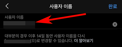 4. 그럼 사용자 이름 부분으로 이동이 됩니다. 기존 이름을 지운뒤 내가 원하는 이름으로 변경 후 완료를 눌러주세요. 14일 내에는 기존 내가 사용하던 이름으로 다시 변경이 가능합니다.