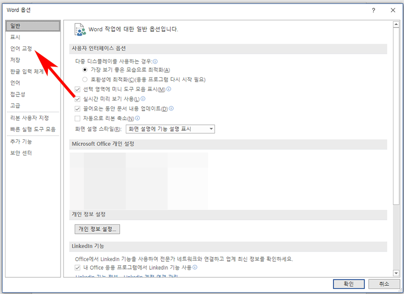 5. Word 옵션에서 3번째 언어 교정을 눌러주세요.