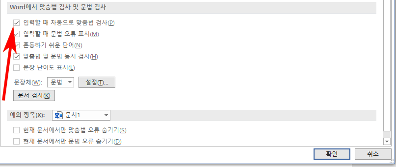 6. 그리고 Word에서 맞춤법 검사 및 문법 검사에서 첫번째 입력할때 자동으로 맞춤법 검사(P) 체크박스에 체크되어있는 것을 볼 수 있습니다. 해당 체크를 해제 해주시고 확인을 눌러주시면 됩니다.