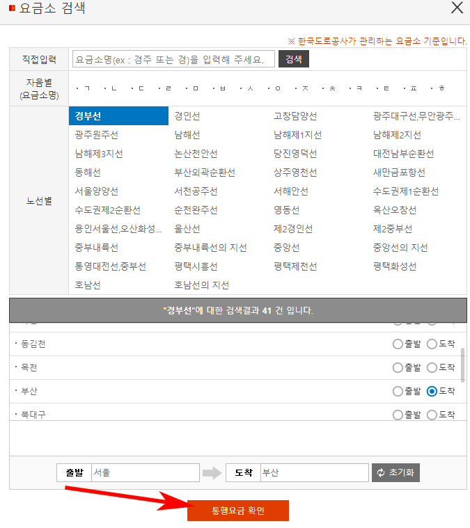 4. 아래와 같이 요금소 검색을 클릭하면 노설별로 요금소를 볼 수 있습니다. 저는 출발 서울 도착 부산으로 선택 후 하단의 통행요금 확인을 클릭했습니다.