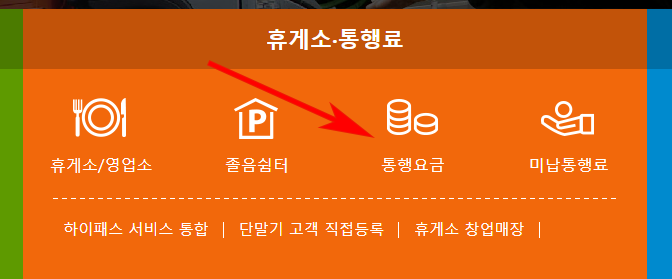 2. 한국도로공사 홈페이지 이동 후 중앙부분을 보면 휴게소·통행료 부분이 보입니다. 여기에서 3번째 메뉴 통행요금을 눌러서 이동해주세요.