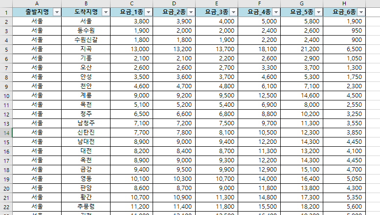 엑셀파일을 보면 이런식으로 출발지 명 도착지명으로 필터가 되어있으니 내가 원하는 요금소를 검색하여 보시면 됩니다.