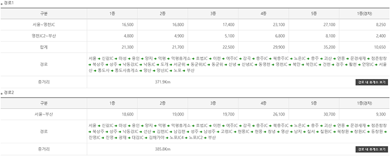 5. 그럼 아래와 같이 경로가 2개가 조회가 됩니다. 차종별로 요금이 상이하여 1종~5종,1종경차까지의 요금을 보여줍니다.