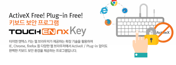"터치엔 엔엑스 키는 웹브라우저가 제공하는 확장 기술을 활용하여 익스플로러,크롬,파이어폭스 등 다양한 웹 브라우저에서 엑티브X / 플러그인 없이도 완벽한 키보드 보안 환경을 제공하는 프로그램입니다."