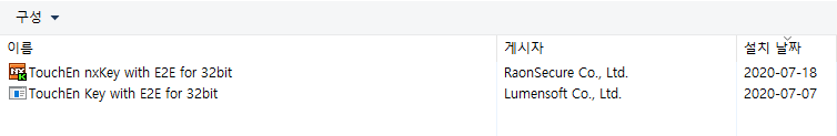 4. 저 같은 경우는 2개가 나왔습니다. nx가 없는 TouchEn Key도 나왔습니다. 이름에 nx가 없는 프로그램은 제작사 루멘소프트입니다. 그래서 검색을 해보니 2012년 경에 루멘소프트와 테라움이 합병하여 라온시큐어로 사명을 변경하였던 것이였네요. 한마디로 같은회사입니다. 아직도 루멘소프트로 설치되는 경우가 있나봅니다.