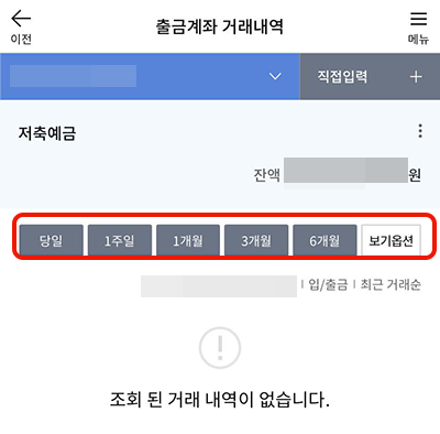 3. 그럼 출금계좌 거래내역으로 이동이 됩니다. 여기에서 상단의 내가 원하는 일자를 선택해주시면 됩니다. 당일부터 6개월까지 조회가 바로 되고 보기옵션은 특정일자를 선택할 수 있습니다.