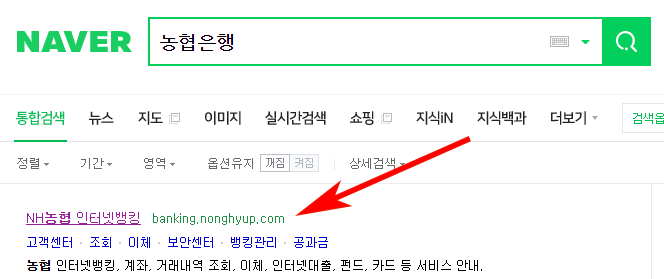 1. 농협은행 홈페이지 온라인 뱅킹을 이용하기 위하여 검색사이트 농협은행으로 검색을 해주세요. 그리고 상단에 보이는 NH농협 인터넷뱅킹 홈페이지로 이동을 해줍니다.