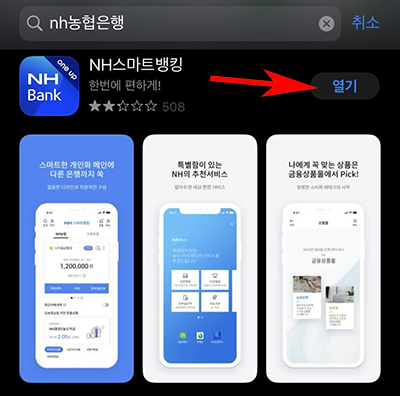 1. 모바입 앱으로 조회를 위하여 NH스마트뱅킹 어플을 설치해주시면 됩니다. 저는 아이폰 사용자로 앱스토어를 이용하여 설치하였습니다. 갤럭시등 안드로이드폰을 이용하시면 플레이스토어에서 검색을 해주세요. 설치 후 열기를 눌러서 이동합니다.