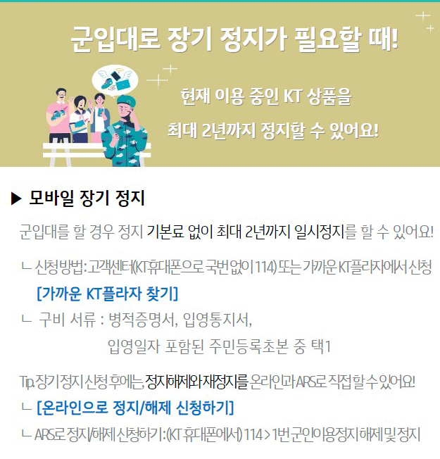 KT에서는 서류를 제출하면 군대 복무 기간 동안 기본료 없이 최대 2년까지 정지가 가능합니다. 대신에 서류를 제출해야되는데요. 준비해야되는 서류와 어디에 제출하는지에 대해 간단히 알아보도록 하겠습니다.