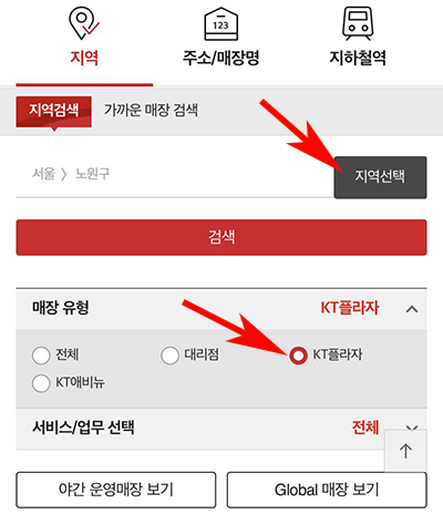 아래 링크를 통해서 매장 찾기를 하시면 됩니다. 지역,주소/매장명,지하철 3개 중 하나를 선택하여 검색이 가능합니다. 검색을해서 가까운 KT 플라자를 방문하여 준비한 서류를 제출하시면 됩니다.